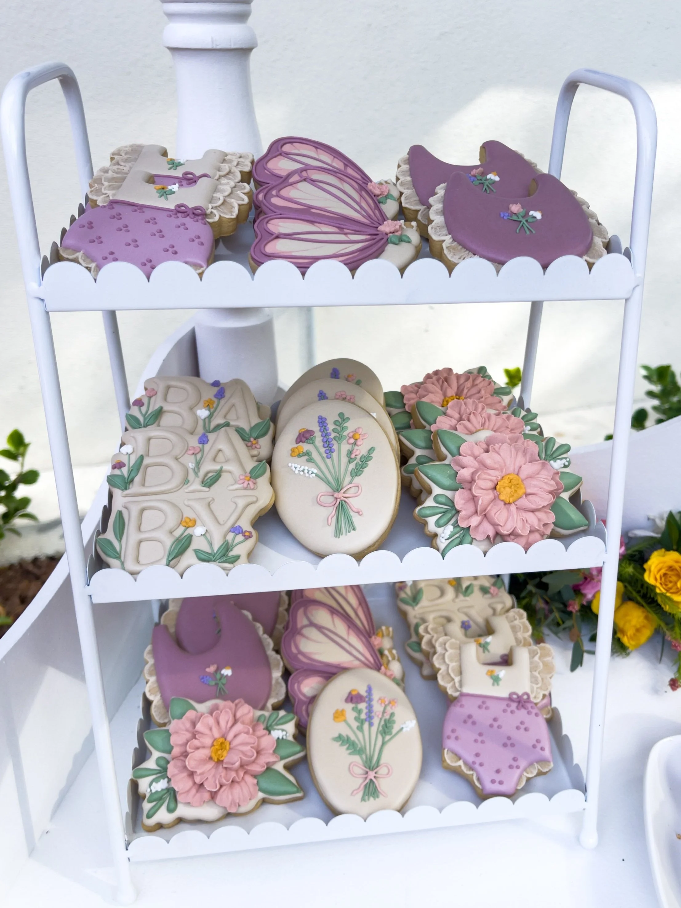 Elaborate cookies start at $72 a dozen with a 2 dozen minimum order. Choose up to 6 different designs and 6 different colors. This includes characters, florals, hand-painted elements, metallics, airbrushing, etc. Please use the inquiry form below for a quote.